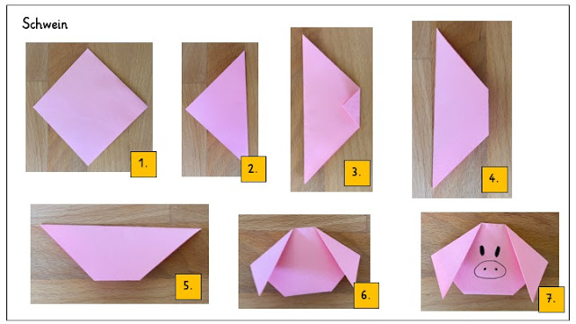 - Wir beginnen mit einfachen Figuren. Du wirst heute einen Schmetterling, eine Katze, ein Schwein und einen Vogel falten. Die Anleitungen findest du hier als Bild.