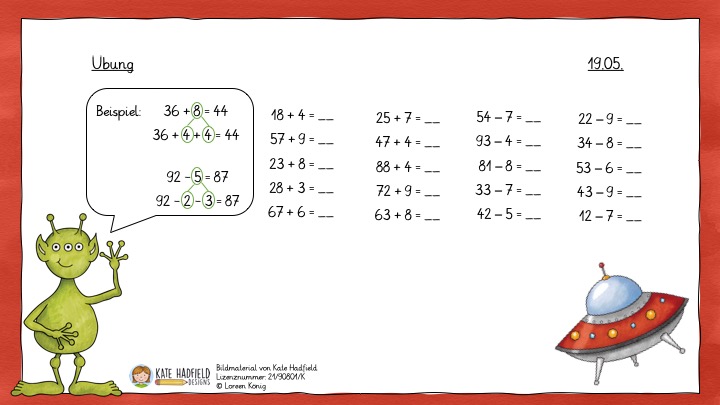 - Schreibe die folgenden Aufgaben ordentlich in dein Heft. Rechne immer erst bis zum vollen Zehner und erst dann weiter. Sieh dir das Beispiel an, damit du weißt, wie du es in dein Heft schreiben sollst.